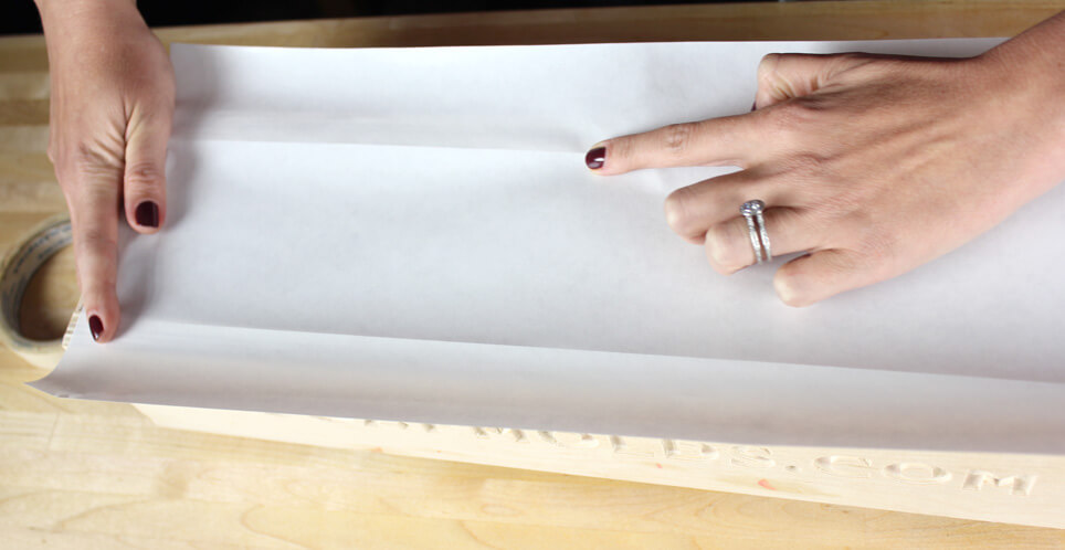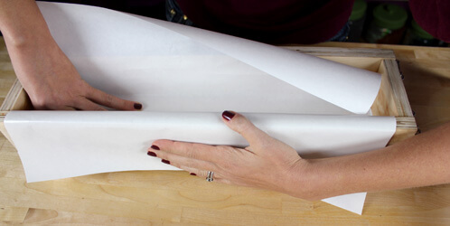 ONE: First we’re going to cut out the big piece of freezer paper that will cover the bottom of the mold. Cut a piece of that will be wide enough and long enough to cover the bottom of the molds AND fold over the sides. Place the freezer paper on top of the mold and use your finger to make a crease on both sides of the paper.