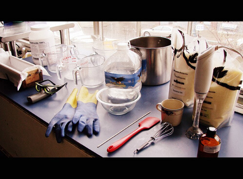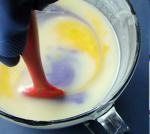 Before beginning, make sure to have all safety equipment and supplies at hand. Have your colors picked and prepared and your fragrance oil weighed, line your wooden mold and have divider inserts set up on the side. Snug fitting rubber gloves are ideal for maximum dexterity (Tip! Pick up some hair-dying gloves from the local beauty supply store). A rubber spatula is your best friend for swirling! This tool manipulates the swirl pattern and pulls it through the entire bar. Use a bamboo skewer for creating finer details and surface swirls. You will also need extra smaller heat resistant pitchers for dividing the soap into sections to color.