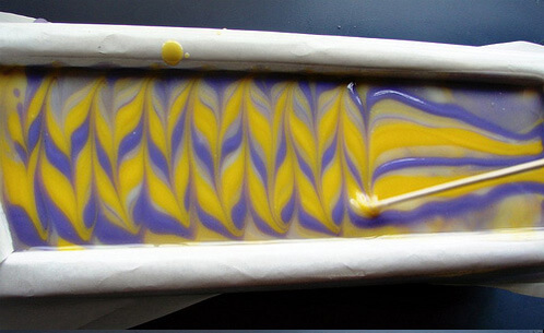 Step 3: Using a stir-stick or spatula, make a single turn clockwise through the soap to give the colors direction.