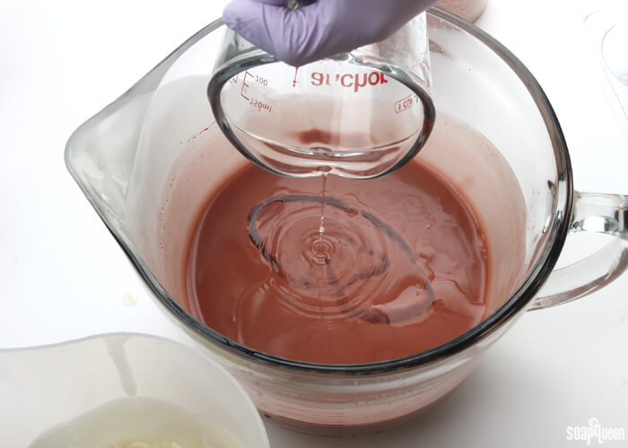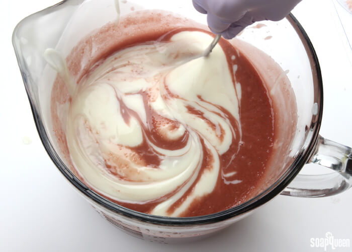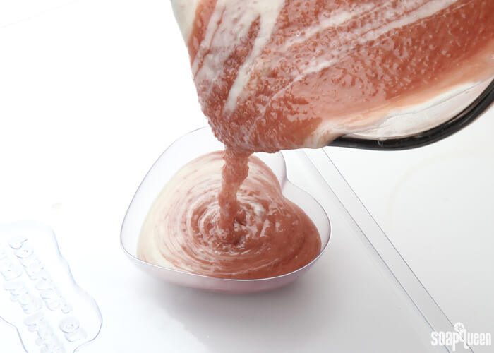 - Holding the white soap about six inches above the pot of rose clay soap, pour the white soap into various areas of bowl. Pouring from high above the bowl allows the white soap to break through to the bottom of the rose clay soap.