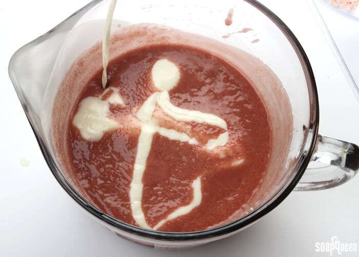 - Once the batter has reached a thin trace, split off about 200 mL of the soap into a separate container. To this container, add 1 Tablespoon of the dispersed titanium dioxide and mix together with a whisk or spoon.