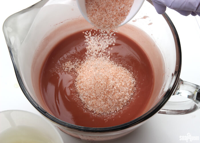 - Add 2 cups of the pink sea salt to the rose clay soap, and mix in with a whisk or spatula.