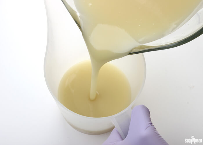 - Slowly and carefully add the lye to the water and gently stir until the lye has fully dissolved and the liquid is clear. Set aside to cool.
