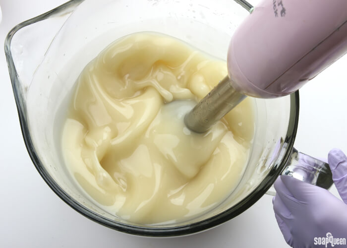 ONE: Slowly and carefully add the lye to the water and gently stir until the lye has fully dissolved and the liquid is clear. Set aside to cool.