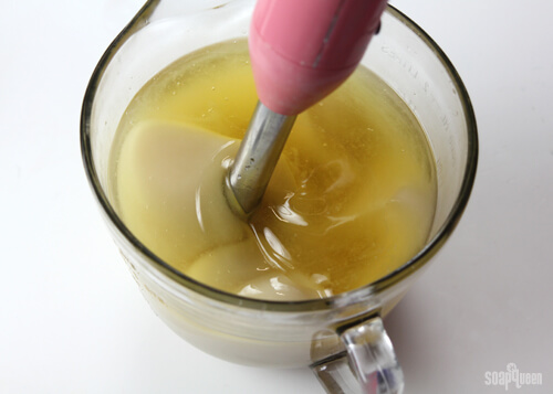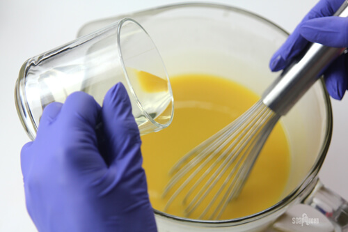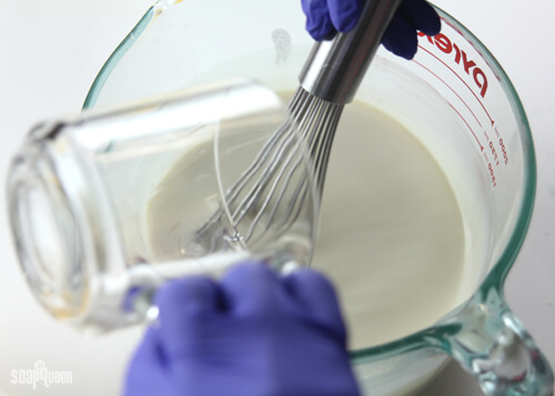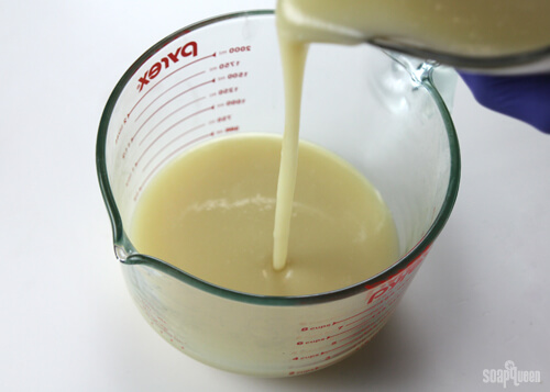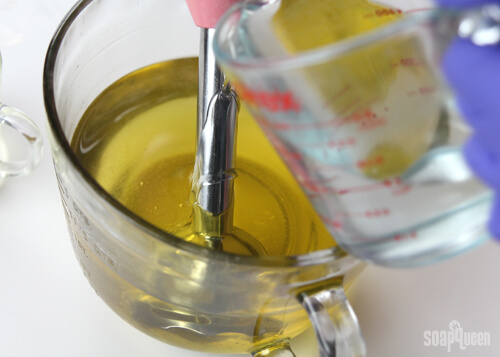 ONE: Slowly and carefully add the lye to the water and gently stir until the lye has fully dissolved and the liquid is clear. Set aside to cool.