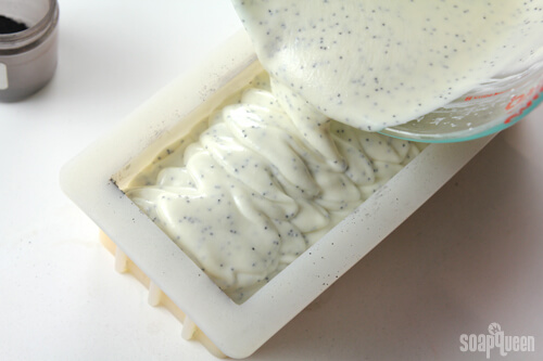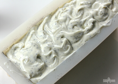 Poppy seeds give this bar of soap gentle exfoliation, and the contrasting mica vein really makes the layers pop. Tip: when cutting into cold process soap that features a mica vein, don’t cut the soap from the top down. Lay the soap on its side and cut in the direction of the line. This will prevent the mica from dragging through the layers.