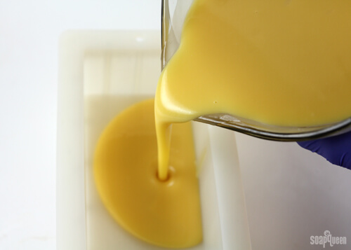 SIX: Carefully pour yellow soap into the mold. Tap down firmly to release any bubbles and evenly disperse soap.