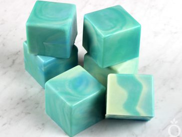 COLOR PREP: In separate containers, disperse 1/2 teaspoon of titanium dioxide, Aqua Pearl Mica, Hydrated Chrome Green Pigment, and Slushy Blue Mica into 1/2 tablespoon sunflower or sweet almond oil (or any other liquid oil). In a separate container, disperse 1 teaspoon Kermit Green Mica into 1 tablespoon lightweight liquid oil. Use a mini mixer to get rid of clumps. OPTIONAL: To ensure that the titanium dioxide blends smoothly into the soap batter, we recommend micronizing it before dispersing it in oil. To micronize the colorant, simply use a coffee grinder to blend it. That breaks up any clumps of color and prevents streaks of white from showing in the final soap. We like to use a coffee grinder that has a removable stainless steel mixing area for easy cleaning.