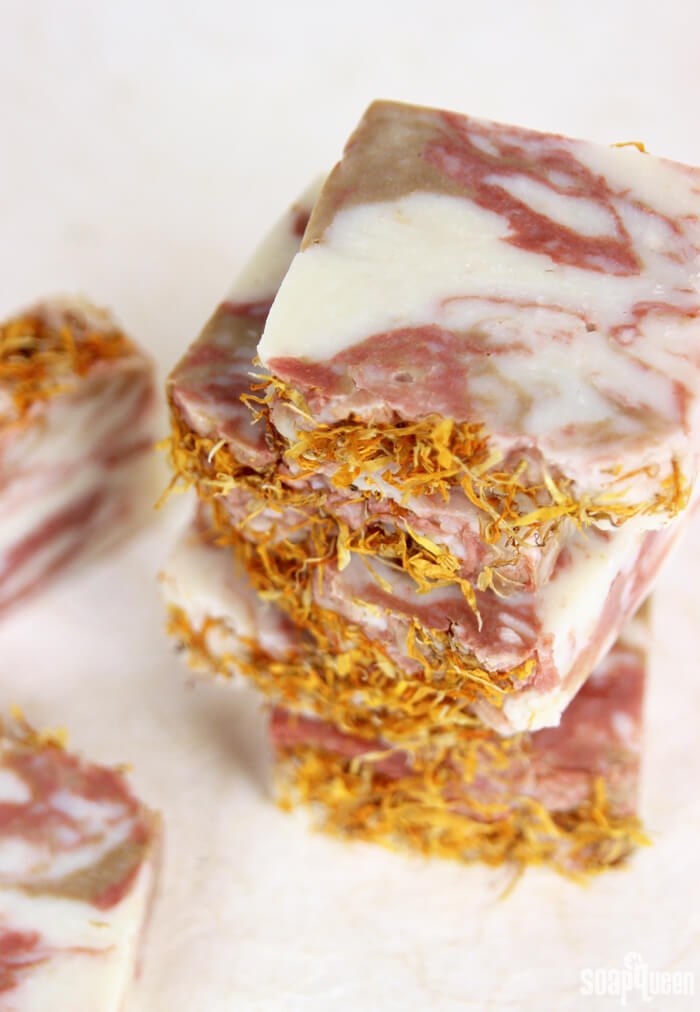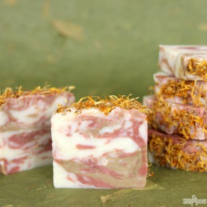 In this project, a Crock Pot is used to cook the soap but you can also use a double boiler. Natural red Brazilian and yellow silt clay give this soap a natural, marbled effect. Calendula petals are placed on top for additional flair.