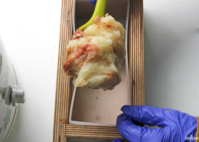 Because hot process soap sets up fast, it can get a lumpy top as you’re working with it. I would recommend having a piece of plastic wrap handy. Once that soap is in the mold, lay the plastic wrap over the soap use your hand (careful, it’s hot!) to smooth it out. You can also use a spatula to help even out that top a little. 🙂