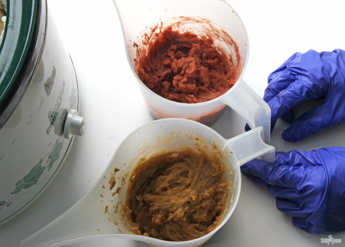 - Split the soap into three even parts, leaving one part in the crock pot and transferring the other to into separate containers to add clays. Color one split batch with all the dispersed yellow silt clay, and the other with all the dispersed red Brazilian Clay. Stir in each of the colors well.