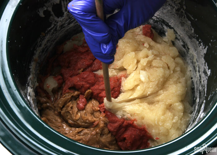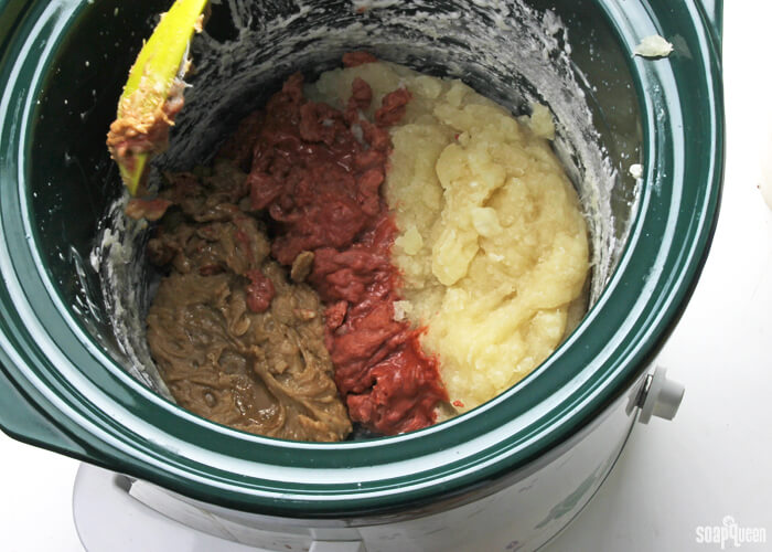 - Move all the uncolored soap still in the Crock Pot to one side of the pot. Spoon the red colored soap next to the uncolored soap. Spoon the yellow colored soap into the pot, next to the red soap.
