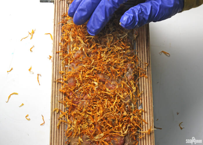 - Once all the soap has been transferred, cover the top with calendula petals and press gently into the soap to help adhere.