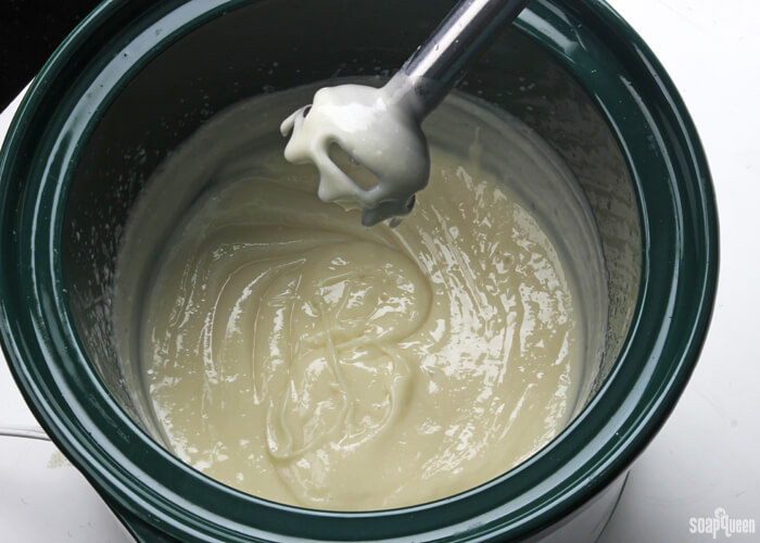 - Mix with a stick blender until a thick trace is achieved.