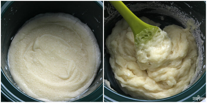 - Put the lid on the Crock Pot and set it to low. After 15 minutes, check the soap to see the progress made. Starting from the outside, the texture and color of the soap will start to change. If the middle does not appear to be changing, stir the batch to ensure even cooking. Don’t be surprised if the soap starts to grow in volume. Do not leave your soap unattended in the first 30 minutes of cook time for this reason. If the soap gets too high in the pot, take the pot off heat and stir like crazy.
