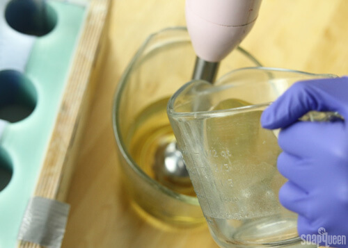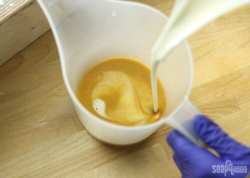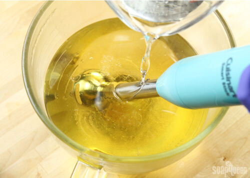 ONE: Slowly and carefully add the lye to the water and gently stir until the lye has fully dissolved and the liquid is clear. Set aside to cool.
