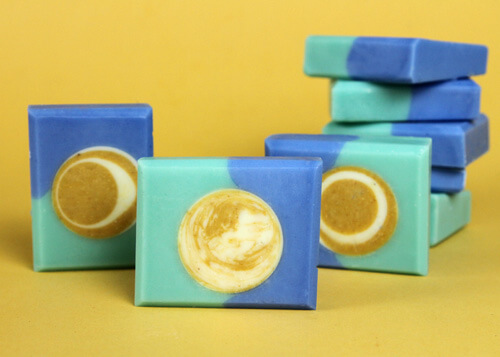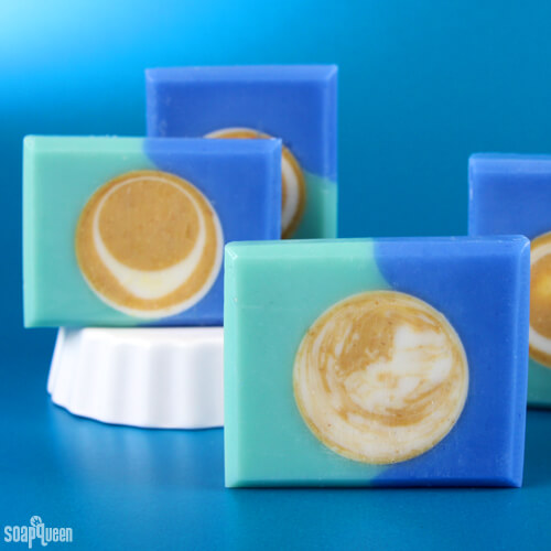 Trying new soap techniques keeps the craft interesting, fresh and fun! This Misty Maritime Moon soap was created for the Negative Space Embed Challenge via Great Cakes Soapworks in August. The negative space embed technique involves cutting holes into the base of soap and later filling the holes with fresh soap.