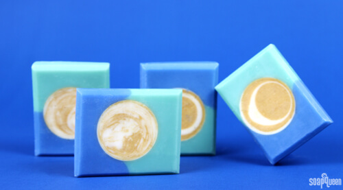 Created with a fresh combination of Pineapple Cilantro, Orange Peel Cybilla and Ocean Rain Fragrance Oils, this soap smells crisp and bright. Orange Peel is used to give both color and texture to the embeds, while titanium dioxide provides contrast. The dual blue tones are made using the Multi-Pour Sectioning Tool, but cardboard can also be used as shown in the Mantra Swirl tutorial. Thanks for all the great name suggestions for this soap via Facebook, they were so much fun to read!