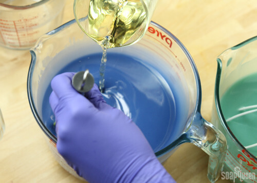 COLOR PREP: Disperse 2 teaspoons of the Aqua Pearl Mica into 2 tablespoons of Sunflower or Sweet Almond Oil (or any other liquid oil). Disperse 1 teaspoon Ultramarine Blue Oxide  into 1 tablespoon of light liquid oil. Use a mini mixer to get the clumps of color worked out smoothly.