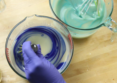 FOUR:Â Add 2 tbs. of Aqua Pearl Mica into one container, and 1 tbs. of Ultramarine Blue into the other. Use a whisk to gently combine.