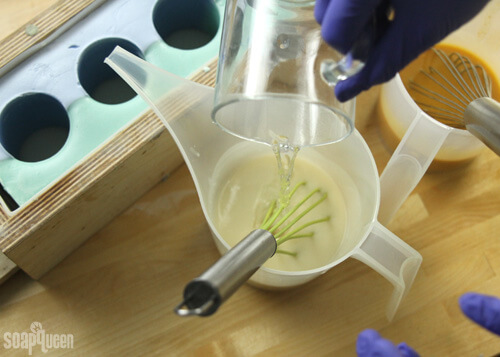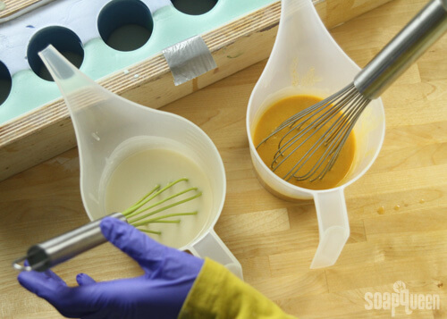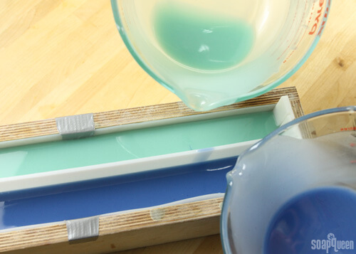 SIX: Gently pour both colors of soap into the two Multi-Pour Sectioning Tool. To help the soap batter evenly spread throughout the sections, you can alternate pouring from each end.