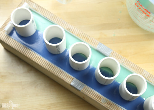 Having no plastic around currently, I used some extra empty toilet paper rolls I had kept for a project. I set them in the mold and poured around them at a medium trace, then immediately poured into them one color at a time (I used four colors). After pouring, I slowly pulled the rolls out. The end product was great! No spreading into the base color, AND I can reuse the rolls–not sure how many time I’ll get out of them, but two is more than one 😉 !
