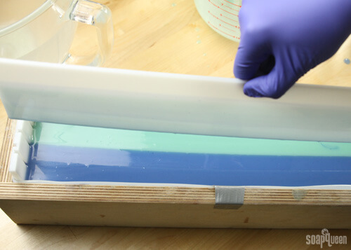 SEVEN: Once the sections are full, slowly remove the center divider straight up and out of the soap. Gently tap down the mold to disperse any bubbles.