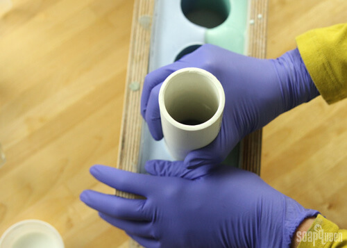 EIGHT: Gently push the PVC pipes into the center of the soap. Make sure there is space between each pipe, and between the mold and the pipes on the ends.