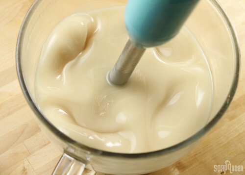 ONE: Combine the coconut oil, olive oil, avocado and palm oils (remember to fully melt then mix your entire container of palm oil before portioning). Once the lye water and the oils have cooled to 130 ° F or below (and are ideally within 10 degrees of each other), add the lye water to the oils and stick blend until thin trace.