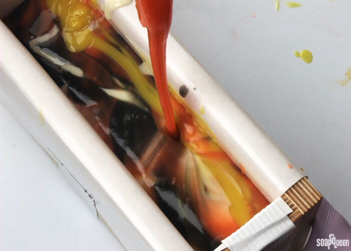 - Holding the black soap above the mold, pour about 1/3 of the soap directly over the yellow soap pour. Again from several inches above the mold pour about 1/3 of the orange soap and the white soap.