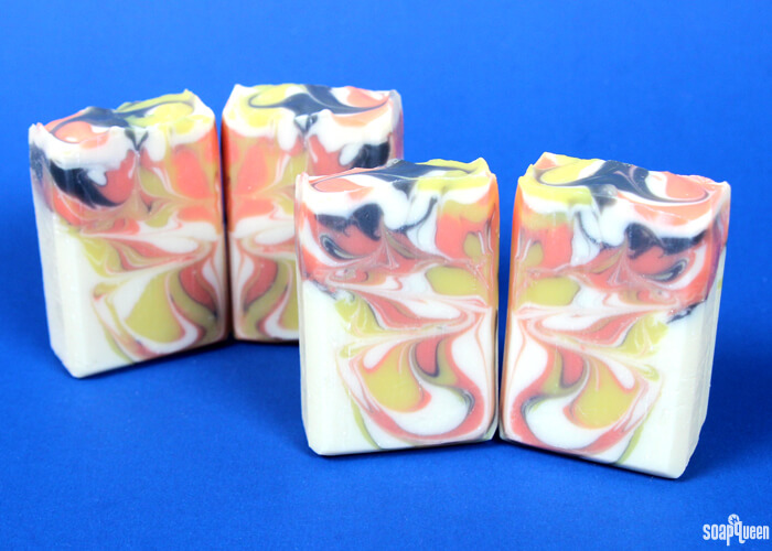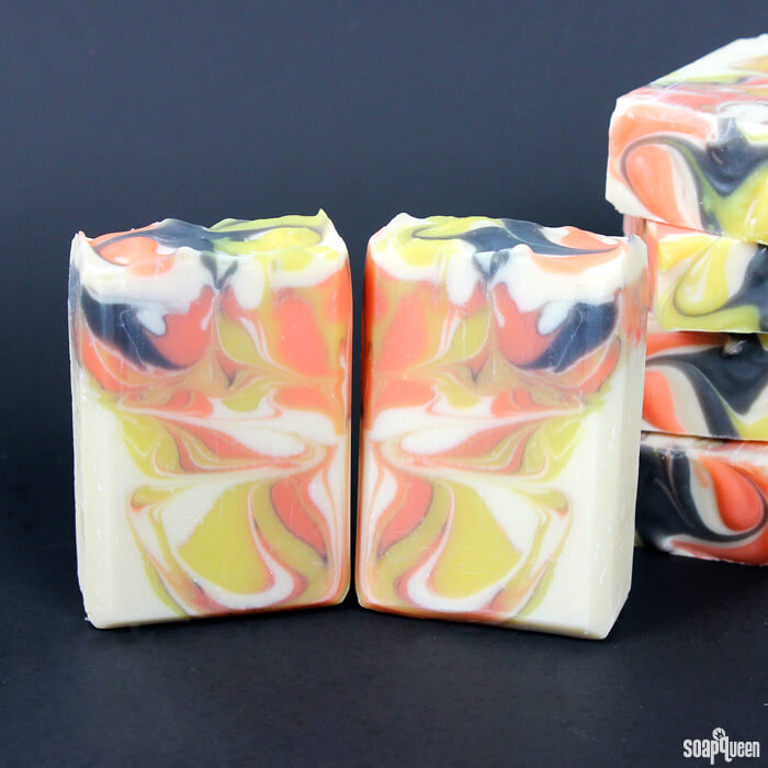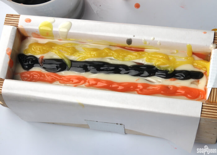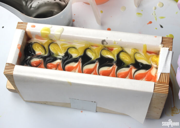 - Cycle through the yellow, white, black and orange colors like this until the majority of all the soap has been poured. Save a small amount of white to cover the top, and a small amount of each color to create a swirl on top.