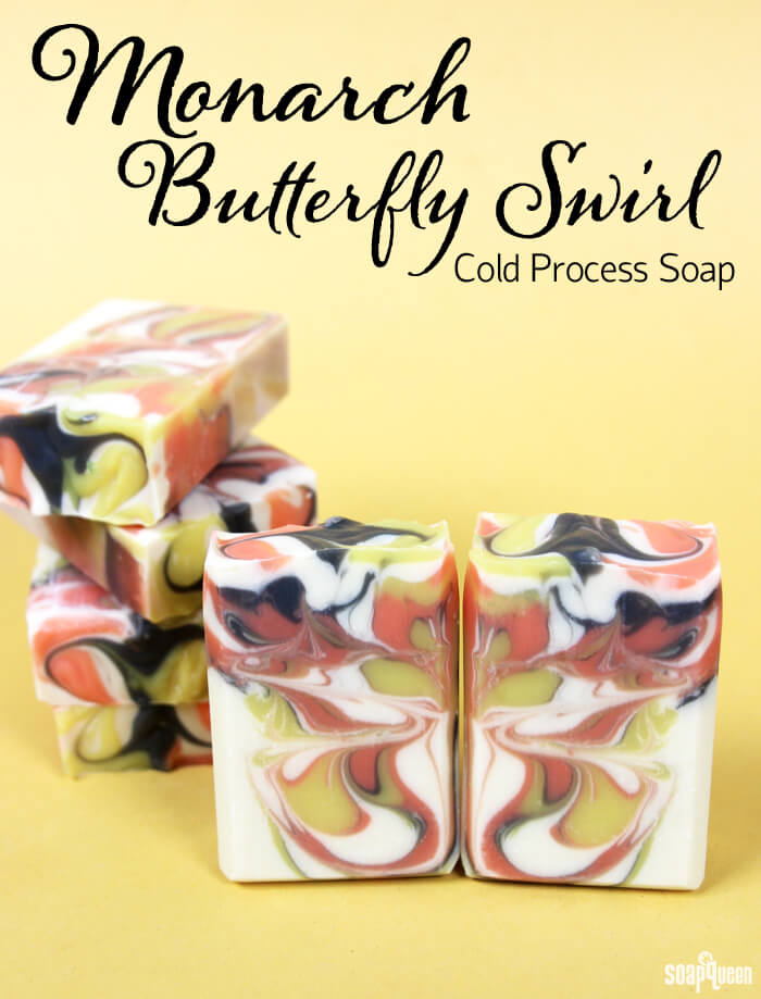With gorgeous orange, yellow and black wings, the monarch may be the most recognizable type of butterfly. It lives in warm climates such as Mexico, California and along the Gulf Coast, and is known for its annual migration from Eastern North America to Mexico. This Monarch Butterfly Swirl Cold Process was inspired by these gorgeous insects. Layers of monarch-colored soap are poured into the mold and swirled with a hanger swirl tool to create the effect of butterfly wings.