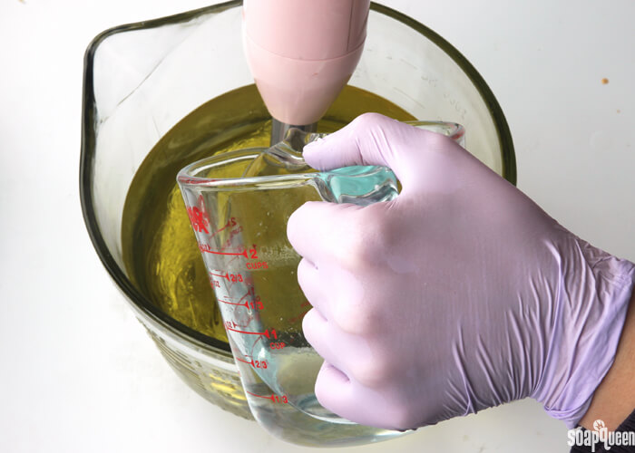 ONE: Slowly and carefully add the lye to the water and gently stir until the lye has fully dissolved and the liquid is clear. Set aside to cool.
