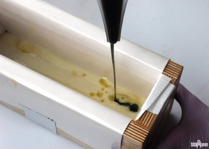 - Repeat this swirl process until you reach the end of the mold. Tap the mold firmly on the counter to release any air bubbles, and spray with 99% isopropyl alcohol to prevent soda ash. Cover with the lid of the mold. Insulate the mold for 24 hours. Unmold after 3-4 days, cut into bars, and allow to cure for 4-6 weeks.
