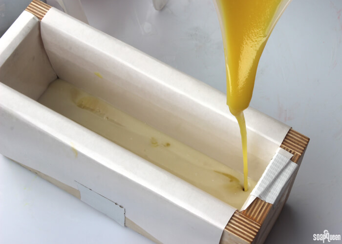 - Holding the yellow soap several inches above the mold, pour about 1/3 of the yellow soap into the mold, allowing the yellow soap to break through into the white. Concentrate the pour into one side of the mold. Pouring the colors into one side helps produce the butterfly wings in the final cut.
