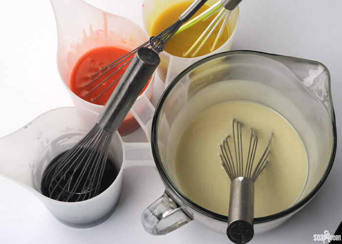 COLOR PREP: To ensure that the Titanium Dioxide blends smoothly into the soap batter, we recommend micronizing it before dispersing it in oil. Please note this is an optional tip but it does help with the titanium dioxide clumping in the soap =) To micronize colorant, simply use a coffee grinder to blend the colorant to break up any clumps of color and prevent streaks of white from showing in the final soap. We like to use a coffee grinder that has a removable, stainless steel mixing area for easy cleaning. Then, disperse 2 teaspoons of the colorant into 2 tablespoon of sunflower or sweet almond oil (or any other liquid oil). In separate containers, disperse 1 teaspoon of the Black Oxide, 1 teaspoon Yellow Oxide, 1 teaspoon Fizzy Lemonade Colorant, and 1 teaspoon Tangerine Wow! Colorant into 1 tablespoons of a light liquid oil. Use a mini mixer to get the clumps of color worked out smoothly.