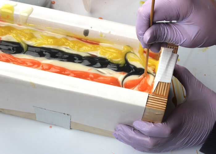 - Carefully pour a line of black soap down the center of the mold on top of the white soap. Don’t worry about the line looking perfect. Then, create a line of orange and yellow soap on either side of the black line, leaving a small amount of white in between each line.