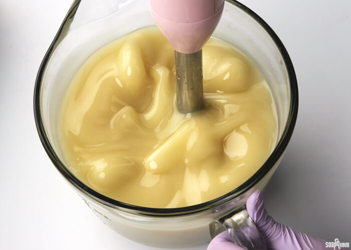 TWO: Melt the Swirl Quick Mix completely. Once the lye water and the oils have cooled to 130 degrees or below (and are ideally within 10 degrees of each other), add the lye water to the oils and stick blend until thin trace. If you’d like a harder bar of soap that releases faster from the mold, you can add sodium lactate to the cooled lye water. Use 1 teaspoon of sodium lactate per pound of oils in the recipe. For this recipe, you’d add about 3 tsp. sodium lactate.