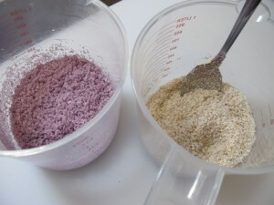 We’re going to do layerd bars. In one container measure out 1 cup of salt, 2 ml Fuchsia LabColor, .5 ml Canary LabColor and .5 oz Baby Rose fragrance oil. In another container measure out 1 cup salt, 1 tablespoon Walnut Shells and .5 Lilac fragrance oil. Mix them both up! I love using floral fragrances with hand-milled or rebatch soap. You don’t run the risk of acceleration like you do when making CP.