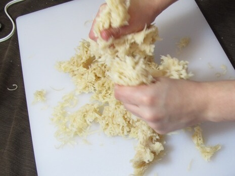 Now for the fun part! Do you have kids? This would be fun for them to help with. Dump the soap shreds onto a cutting board and mix and squish like play-dough!