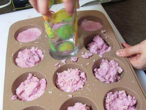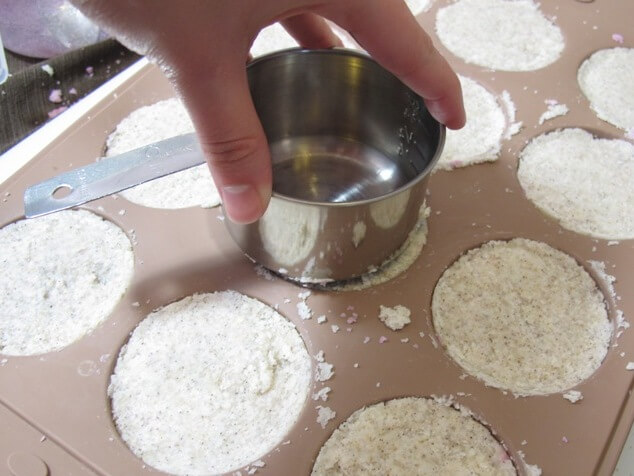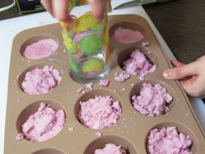 Once you get it nice and mixed…divide it up into your mold. Once again use a cup to press everything down. Press hard!