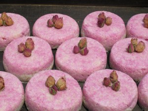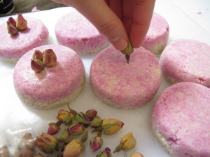 I put these in the freezer for about 30 minutes and they were ready to unmold. I had some Pink Moroccan Rosebuds that I thought would look perfect on top. So I stuck about 3 into the middle of each soap.