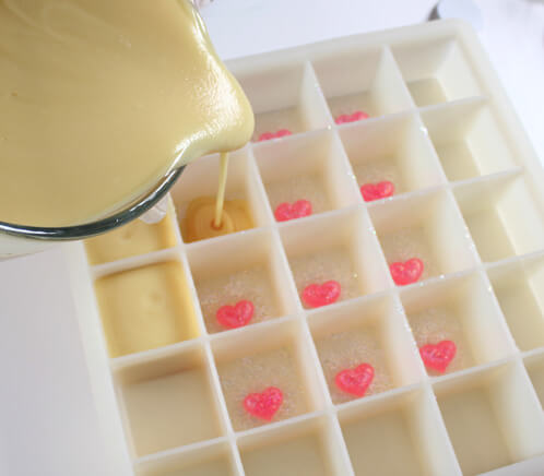 TWO: Once the melt and pour has set-up, unmold the soap and place one heart soap in the bottom of 18 cube cavities of the mold. Make sure the flat side of the soap is on the bottom.