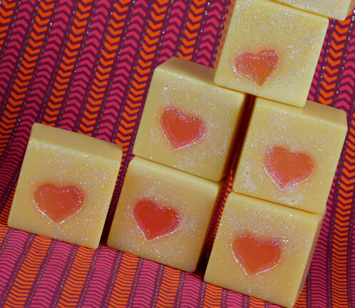 I’m still in love with our new silicone cube mold (I’m sure you can tell from the recent cube mold tutorials: Holiday Cubes and  Crazy for Cubes). I even designed a brand new mini heart mold specifically for embedding in the cube mold (now that‘s love). The technique of combining melt and pour with cold process soap is super simple with lovable results. It’s even easy enough for CP beginners!