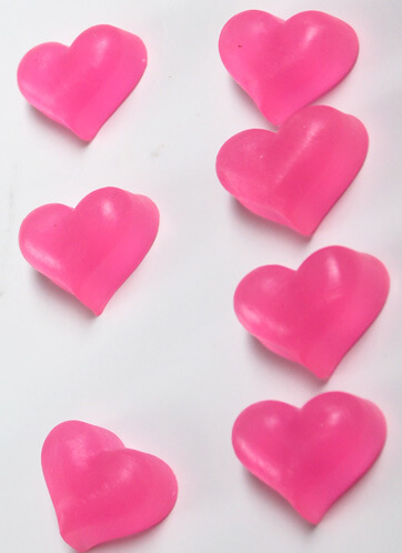 ONE: Prepare your melt and pour heart soaps using Low Sweat Clear Base and Electric Bubble Gum Colorant. For basics on melt and pour soap, click here. Make about 18 little pink hearts. Be sure to mix your Bubble Gum colorant in Liquid Glycerin (1/3 Cup of Liquid Glycerin to 1/2 teaspoon of Bubble Gum Colorant), then added 1/4 teaspoon per pound of soap. Check out a tutorial on mixing your Neon Colorants HERE .