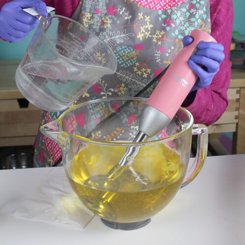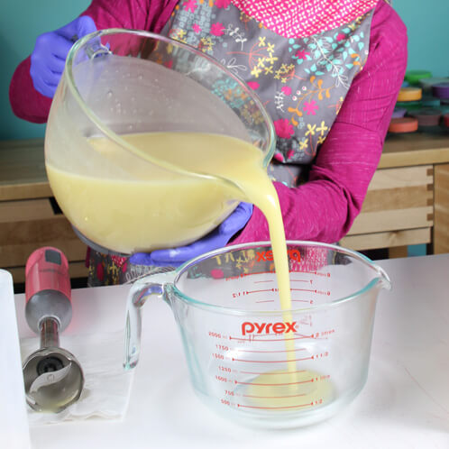 THREE: Once the oils and the lye water have cooled to 130 degrees or below (and ideally within 10 degrees of each other), slowly and carefully pour the lye water into the oils. I like to pour down the shaft of my stick blender to prevent air bubbles.