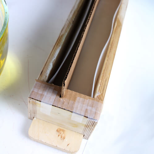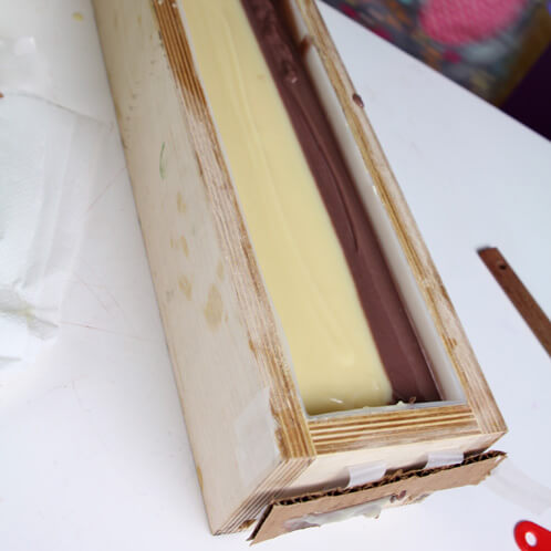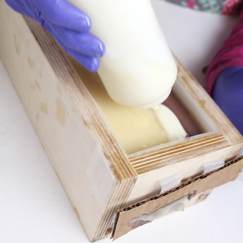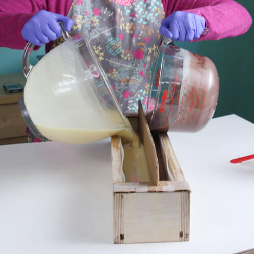 SEVEN: Time to harness that core strength! Pour both soap batches into the mold at the same time. Remove the faux divider from the mold.