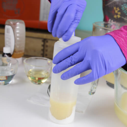 FOUR: Bring the soap batter to light trace. Pour some of the batter into the condiment bottle with the dispersed Titanium Dioxide, filling the bottle about 1/3 full. Replace the cap on the bottle, and with your (gloved) finger covering the tip, shake the bottle to mix up the soap batter and colorant. Release your finger with the tip pointing away from your face.