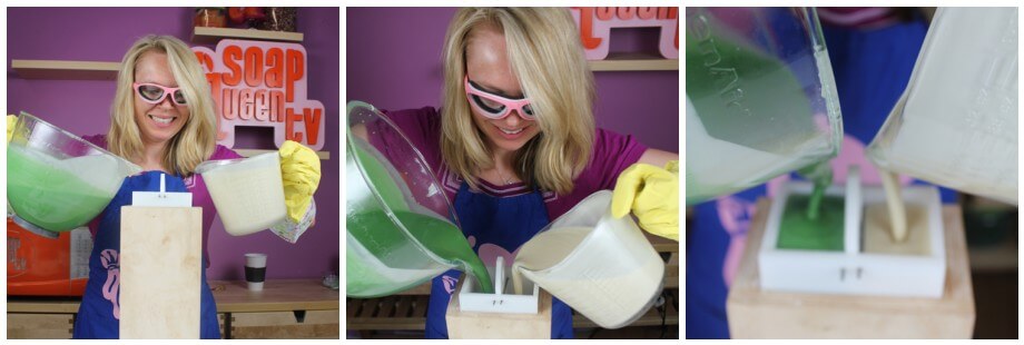 SIX: Time for some core strength! With the center divider in place, pour both batches into the Vertical Mold at the same time. Get as much soap in there as you can – you might have some left over, but we’ll use that soon.