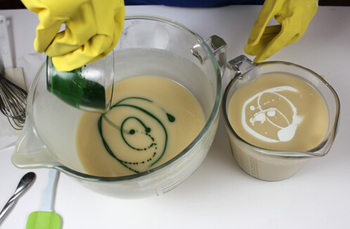 FOUR: Split the batch in half. Each half should be about 4.5 cups. Add all of the dispersed Titanium Dioxide to one batch, and all of the dispersed Green Chrome Oxide to the other batch. Mix well, using a whisk if needed to avoid trace acceleration.